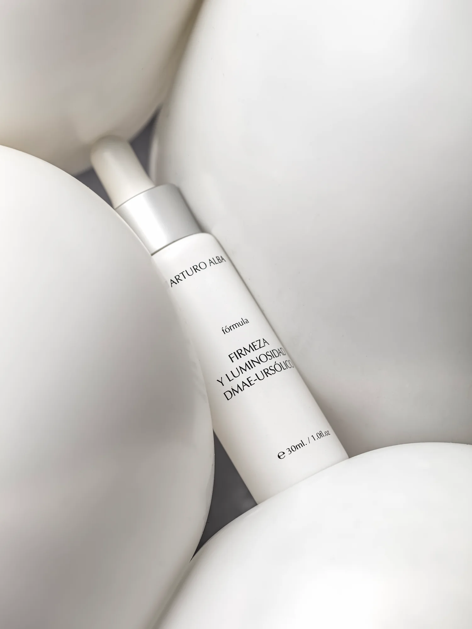 Sérum ultrafluido compuesto por una mezcla de potentes activos reafirmantes, iluminadores e inductores de la elasticidad como el DMAE y el ácido ursólico que actúan en sinergia junto a los activos potenciadores de la oxigenación celular y la síntesis de colágeno como las sales orgánicas de cobre, magnesio, zinc, calcio y silicio.